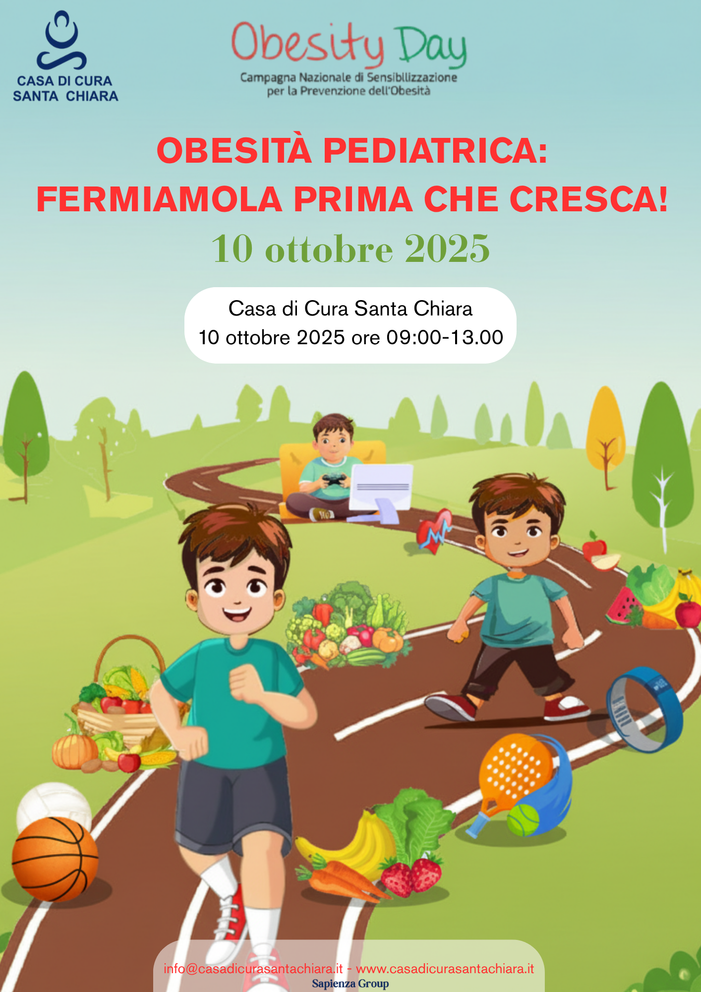 Unisciti a noi il 10 ottobre 2025 per la Campagna Nazionale di Sensibilizzazione per la Prevenzione dell’Obesità. Ti aspettiamo presso la Casa di Cura Santa Chiara dalle 09:00 alle 13:00 per un importante momento di informazione e prevenzione.